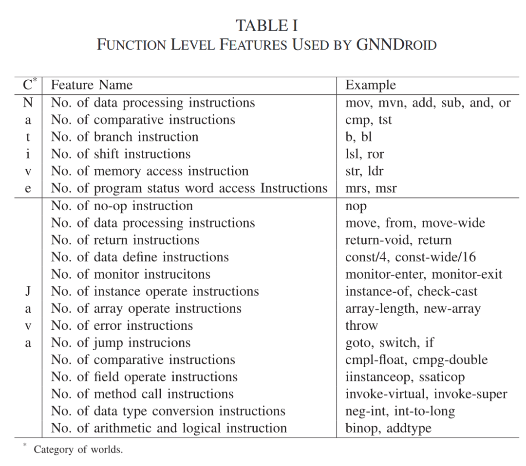 GNNDroid将MRDG向量化处理:首先提取节点的函数级特征(Java与Native共20种,Java 特征的选择基于 JVM 官方文档。Native特征的选择则基于微处理器架构和编译器优化配置,见下表),再使用Word2Vec向量化边的语义信息。随后,利用门控图神经网络(GGNN)进行图的学习与分类建模。GGNN通过多轮信息传递与更新,捕捉节点间复杂关系,实现恶意软件的判别。