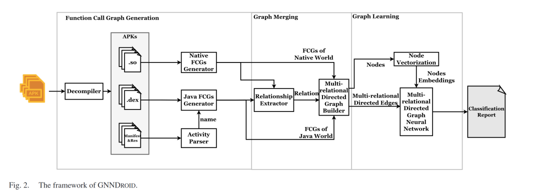 为了应对跨语言恶意代码检测中的代码异构性、调用关系复杂和语义信息缺失三大挑战,本文提出了一种基于图神经网络的跨语言恶意软件检测框架——GNNDroid。该系统主要分为三个阶段:
