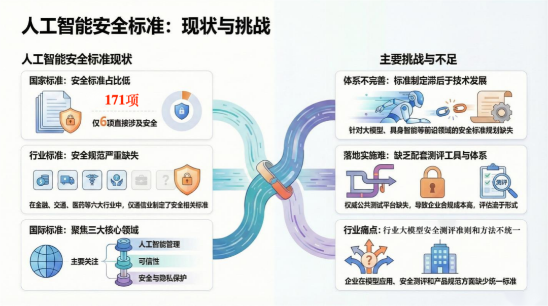 人工智能安全标准面临的挑战主要有标准体系不完善、标准落地实施难等。