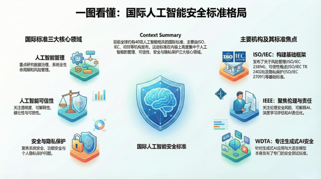 人工智能安全相关的国际标准有40余项,标准发布机构主要有AFNOR、DIN、IEC、ISO、WDTA。目前,与人工智能安全相关的国际标准及文件主要为基础概念与技术框架类通用标准,在内容上集中在人工智能管理、可信性、安全与隐私保护三个方面。