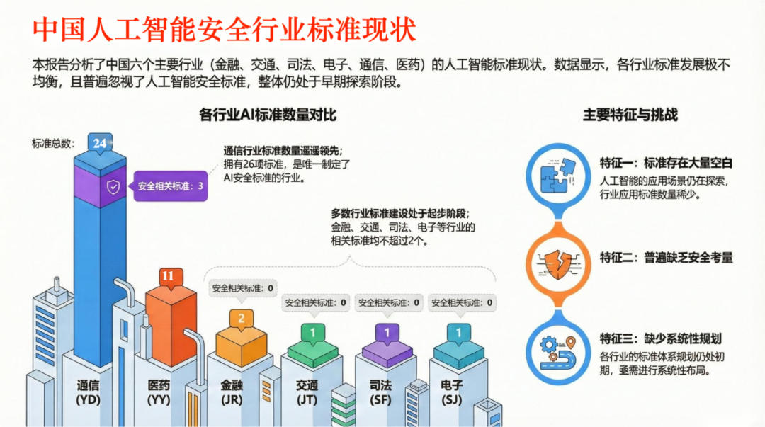 在国家标准方面,当前共有 171 项与人工智能相关的标准,其中涉及人工智能安全的仅有 6 项。