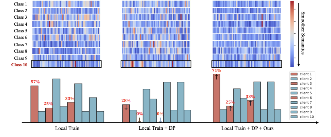 如下热力图展示了十个客户端在不同训练阶段其全局语义空间的平滑度,颜色从红到蓝代表平滑度增加。柱状图则展示了每个客户端在不同训练阶段对第十个类别的测试准确率;在第十类语义理解上出现显著变化的客户端被标记为粉色,其余为绿色。