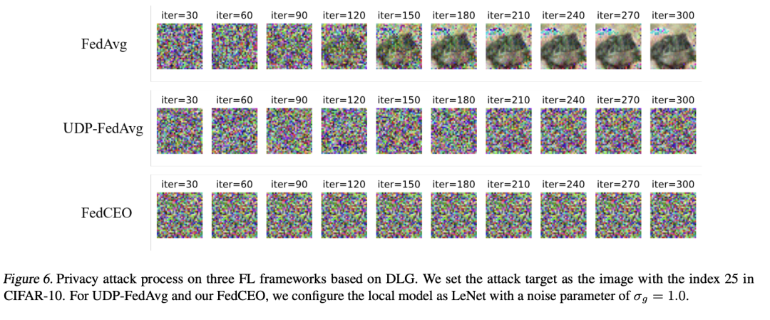 下图展示了在CIFAR-10上,三种联邦学习框架的隐私保护性能。FedCEO和UDP-FedAvg都表现出对隐私攻击的强劲防御能力(具有更低的峰值信噪比PSNR),而DLG攻击成功从FedAvg的客户端推断出了敏感图像。