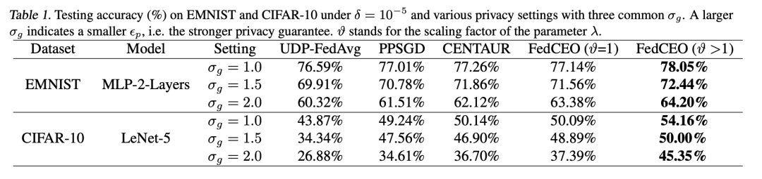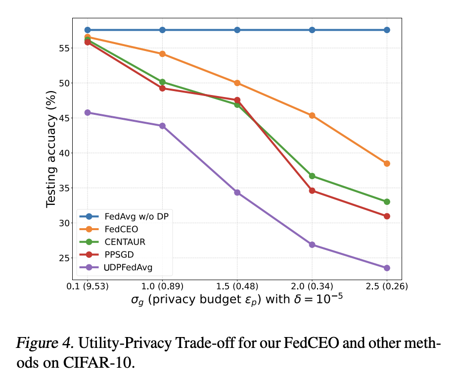 效用提升:在相同隐私预算(添加噪声水平)下,FedCEO相比UDP-FedAvg、PPSGD、CENTAUR等方法在测试准确率上显著提升;