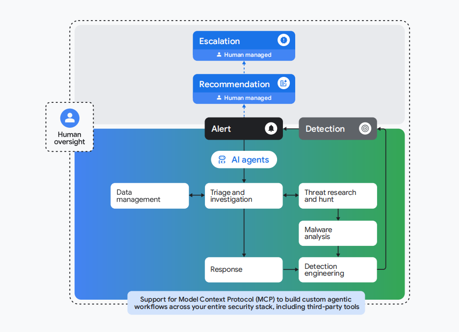 安全运营周期图展现了人类与智能体的协同模式:AI智能体负责数据管理、分诊、分析等战术任务,人类则聚焦于升级决策、规则优化与战略防御。