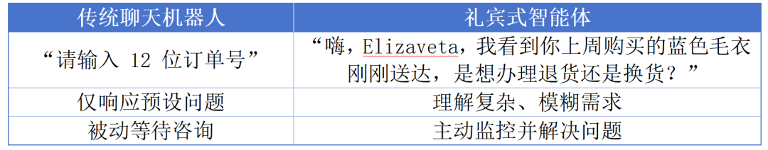 过去十年,客户服务自动化的核心是“预制聊天机器人”,仅能解答简单问题;2026年,随着大模型的发展,将从“被动响应”到“主动预判”的服务升级,将催生“礼宾式智能体”,能够记住客户偏好、关联历史交互,提供个性化、人性化的一对一体验,甚至主动预判并解决问题。