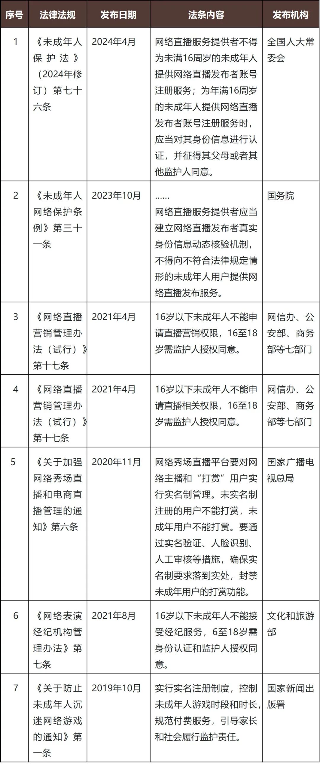 未成年人个人信息处理应严格遵守相关法律法规,按照数据处理的全生命周期设立完善的管理制度和安全措施,建立完善的未成年人保护体系,确保未成年人个人信息在收集、使用、存储以及删除等环节的安全与合规。但对于网络直播服务提供者而言,《未保条例》首次规定了真实身份信息动态核验机制,这对其未成年人个人信息保护义务要求更高,需要同时满足动态核验要求和个人信息保护合规要求。因此,对于网络直播服务提供者来说,报送未成年人个人信息保护合规审计情况宜将动态核验机制作为审计重点事项之一。同时,除了《未保条例》里明确规定的网络直播服务提供者,其他如网络游戏、网络经纪相关行业也有严格的未成年人年龄限制要求(详见下表),需要平衡识别和保护之间的关系,也应考虑重点审计相关事项。