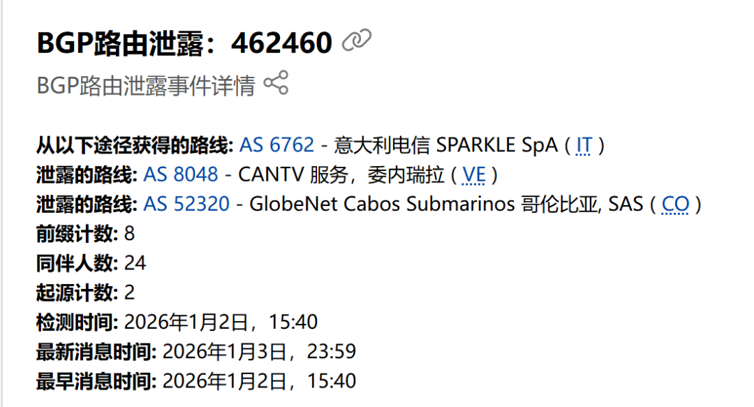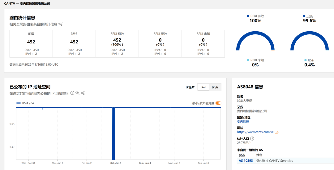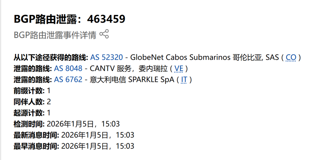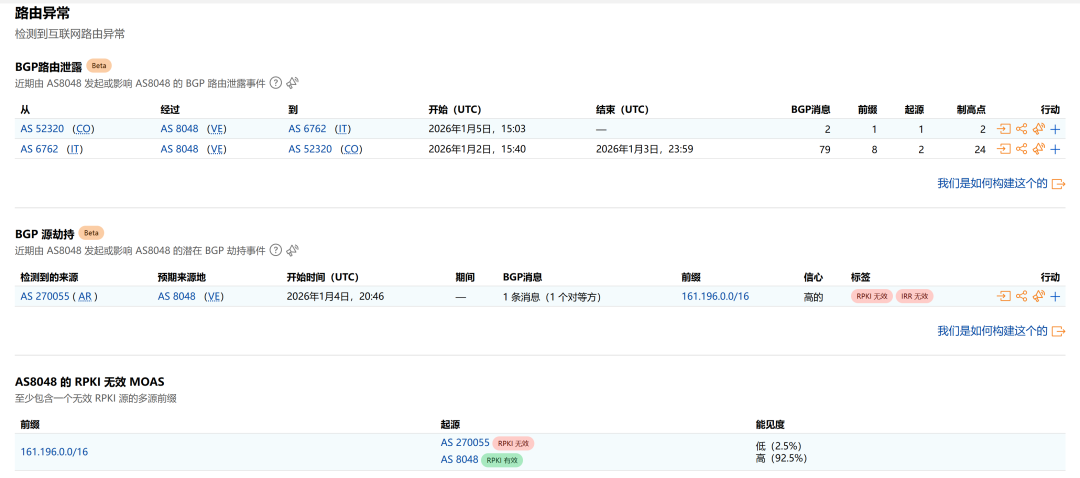 与此同时,国外网络安全研究人员观察到委内瑞拉国有电信运营商相关自治系统(AS)出现的BGP路由异常,引发了技术社区的广泛讨论。