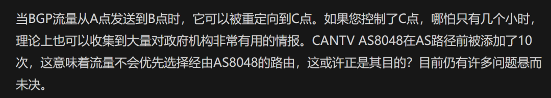 2、TechPlanet后续文章《BGP Anomalies Reveal Digital Fingerprints of Venezuela"s Political Crisis》在复述相同技术细节的基础上,将异常置于委内瑞拉政治动荡背景中讨论,但同时引用专家意见:“这很可能只是误配置,没有明显恶意迹象”。