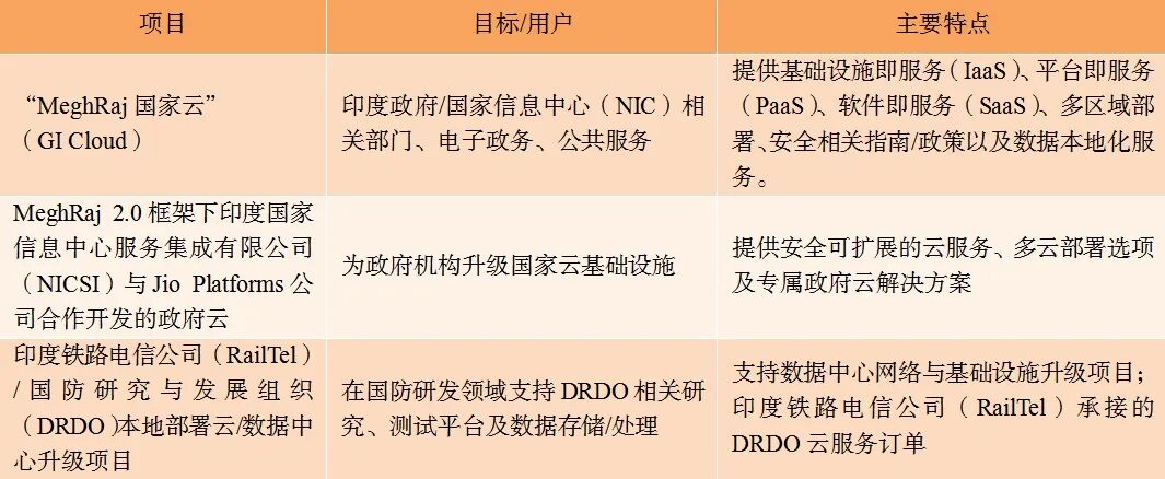 • 合作与投资:战略资金投入与合作举措包括:与印度铁路电信公司(RailTel)公司达成协议,推进数据中心现代化,为DRDO提供本地云服务;依托印度国家信息中心服务集成有限公司(NICSI)和Jio Platforms数字科技公司运营的政府社区云平台。