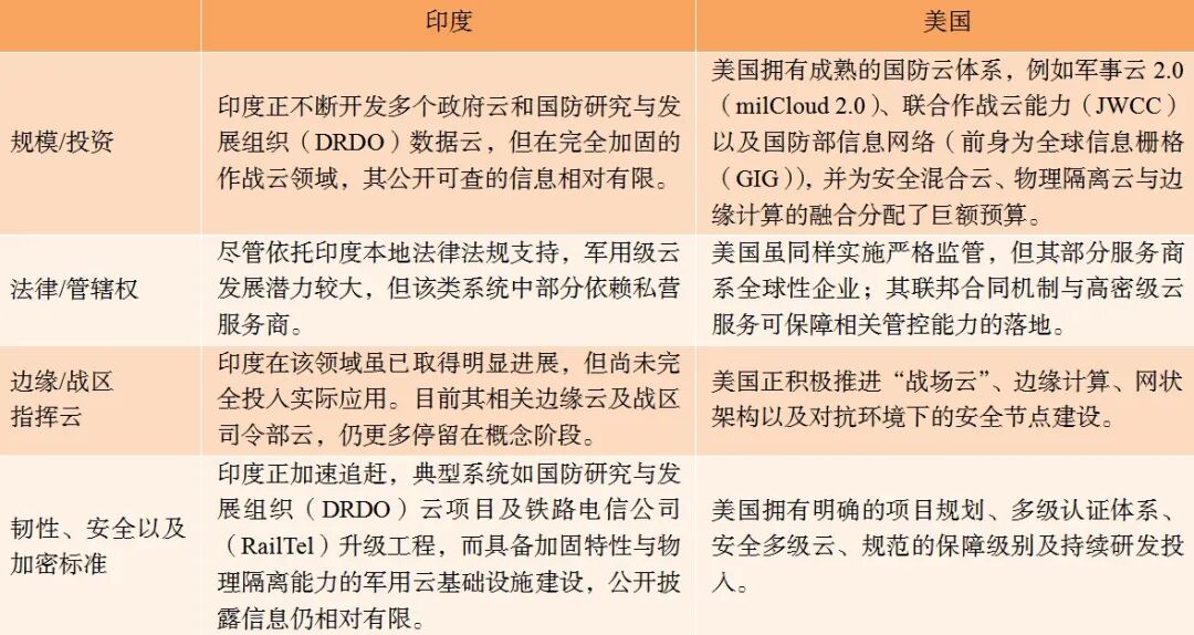 表2 印度和美国军事/政府数字云架构