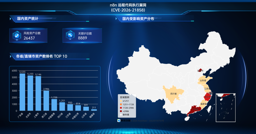 奇安信鹰图资产测绘平台数据显示,n8n 远程代码执行漏洞(CVE-2026-21858)关联的国内风险资产总数为26437个,关联IP总数为8889个。国内风险资产分布情况如下:
