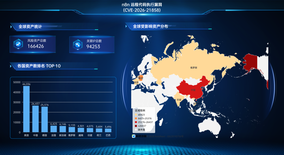 n8n 远程代码执行漏洞(CVE-2026-21858)关联的全球风险资产总数为166426个,关联IP总数为94253个。全球风险资产分布情况如下: