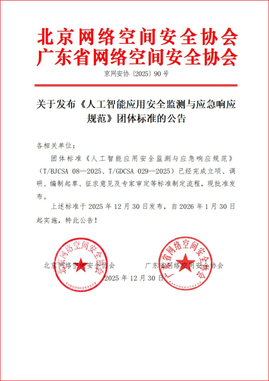 关于发布《人工智能应用安全监测与应急响应规范》团体标准的公告