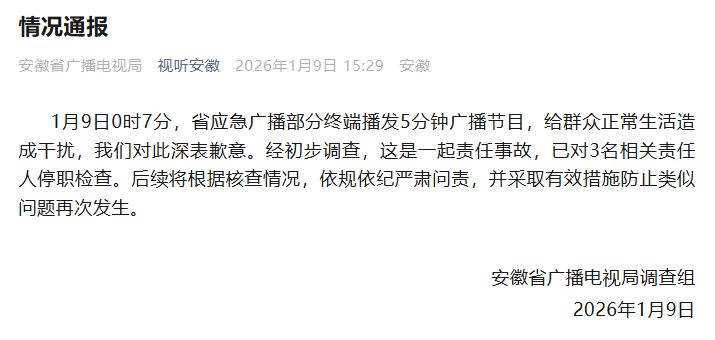 1月9日0时7分,省应急广播部分终端播发5分钟广播节目,给群众正常生活造成干扰,我们对此深表歉意。经初步调查,这是一起责任事故,已对3名相关责任人停职检查。后续将根据核查情况,依规依纪严肃问责,并采取有效措施防止类似问题再次发生。