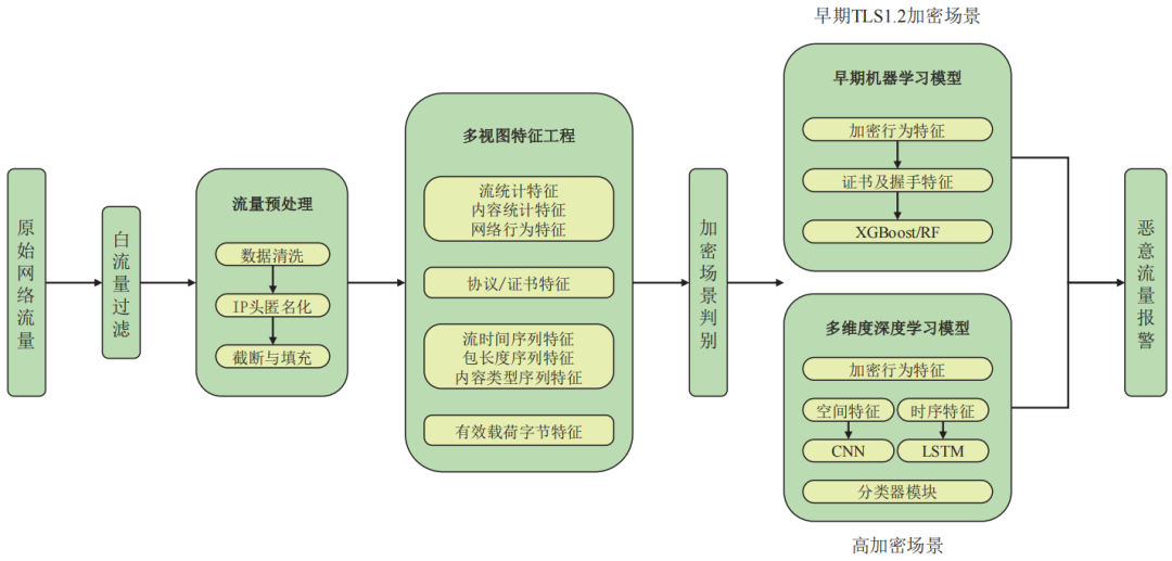 具体来说,首先会根据能否提取到证书及协议特征来判断TLS加密协议的版本,随后依据判别结果采用相应的模型。若流量属于TLS1.2场景下或包含证书、协议等相关特征,使用早期模型进行检测,以充分利用加密行为特征进行高效识别;若流量属于TLS1.3场景或其他高加密场景下,则采用多维度深度学习模型,通过融合加密行为特征与多视图时空序列特征实现对高加密流量的精准检测。该模型自适应检测框架不仅保证了模型在不同加密版本下的适用性和通用性,也最大化提升了检测精度。