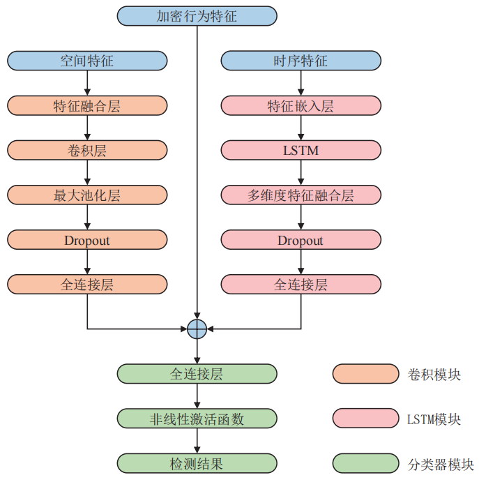 其中,左侧分支卷积模块用于学习流量数据中的空间特征,捕获数据内部的空间依赖关系。该模块通过特征融合层将多尺度空间特征映射至统一表示空间,随后经过卷积层提取局部相关性特征。最大池化层用于下采样并保留最显著的空间特征,Dropout层防止过拟合,最终的全连接层得到空间特征的高层表示。右侧LSTM模块针对时间序列类输入,如包长度序列或时间间隔序列,用于刻画流量数据在时间维度上的相关性,挖掘通信行为的时序依赖性。模块首先通过特征嵌入层,将离散的内容类型序列映射为连续向量序列,之后经过多维度特征融合层整合三类时序特征,随后经Dropout层提升模型泛化能力,并通过全连接层统一最终输出维度。整体架构结合了两分支输出的空间特征与时间特征,同时捕捉时空依赖关系,并结合加密行为特征进行后续的综合表示和检测,有效提升模型对复杂加密行为的表征与识别能力。