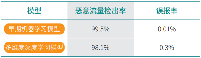 如上述两部分所述,在基于AI的恶意流量检测模型的应用过程中,早期的机器学习模型和多维度深度学习模型均可对TLS1.2及此前版本的加密恶意流量进行检测。因此,我们做了如下的对比实验验证两模型的效果。实验采用数据集包含僵尸网络、恶意软件、APT攻击的恶意流量和来自交行企业内部的白流量共50万条,模型设置与实际部署时一致(见下文),实验结果如表1所示。