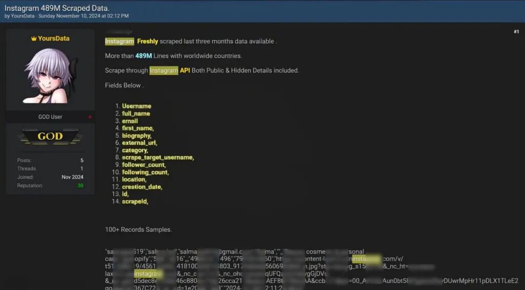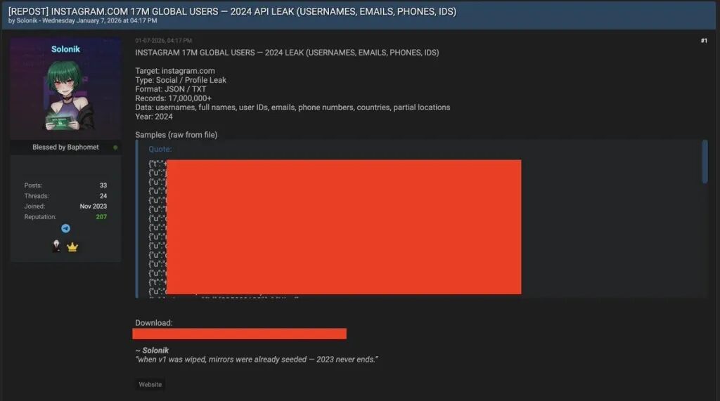 研究人员发现,一个包含敏感信息的数据库正在某网络犯罪论坛上出售,售卖者声称这是一个影响近1800万名Instagram用户的“人肉搜索工具包”。与以往的数据抓取事件不同,此次泄露的数据包含了与Instagram用户ID直接关联的实体家庭住址。