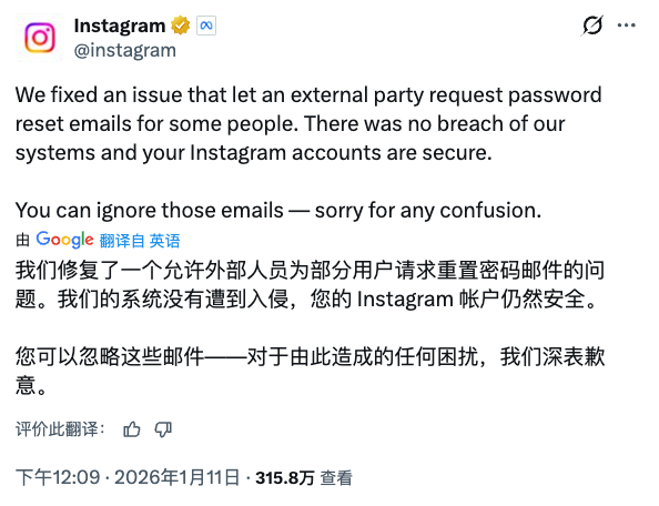 Instagram官方推特账号在11日回应称,刚刚修复了一个允许外部人员为部分用户请求密码重置邮件的问题,系统未遭到入侵。
