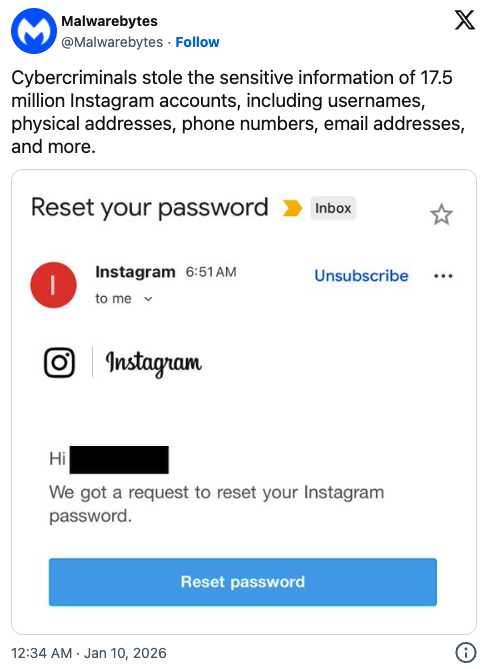 安全内参1月12日消息,安全厂商Malwarebytes Labs的研究人员警告称,一起重大的数据泄露事件导致约1750万名Instagram用户的个人数据被暴露。泄露的数据包括用户名、实体住址、电话号码以及电子邮件地址。