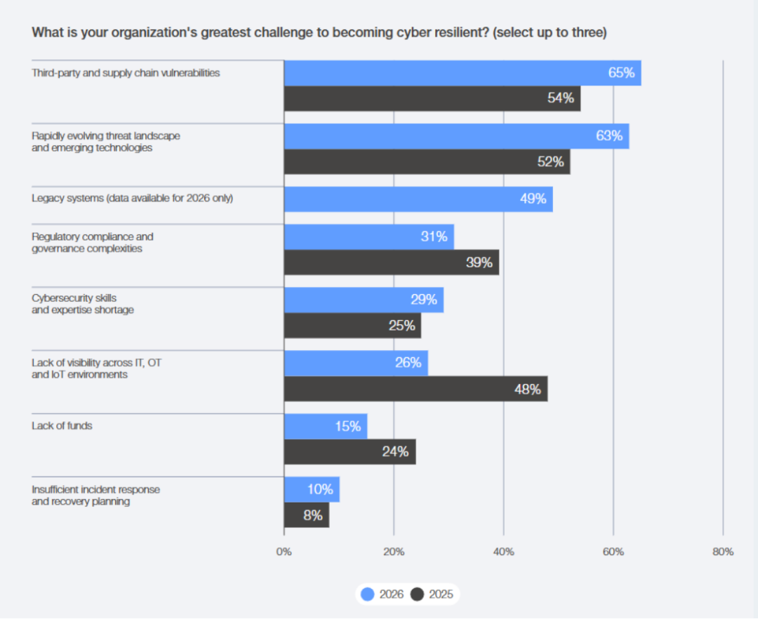 在自主系统与机器人方面,26%的受访者认为其将对2026年的网络安全产生影响,在2030年之前,这种影响力会持续增强。