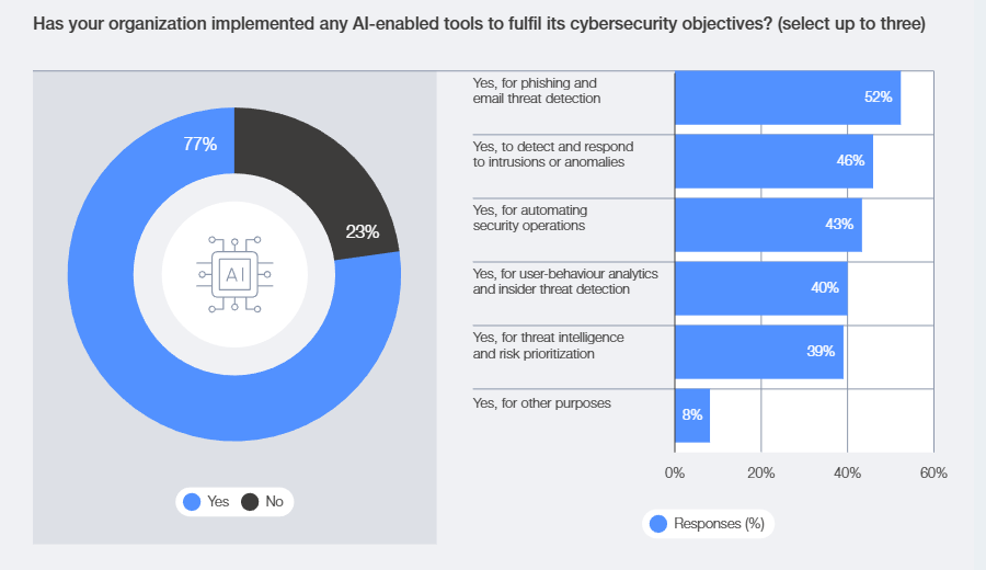 行业应用呈现差异化:能源部门侧重异常检测(69%),材料与基础设施行业聚焦钓鱼防护(80%),而制造与运输领域则偏向安全运营自动化(59%)。