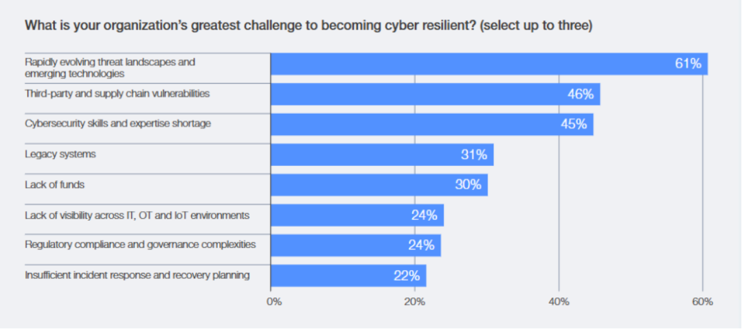 99%的高韧性组织拥有深度参与网络安全事务的董事会,其中过半数能获得定期简报、进行积极互动并明确监督职责。与之相对,韧性不足的组织在此方面存在显著缺失。