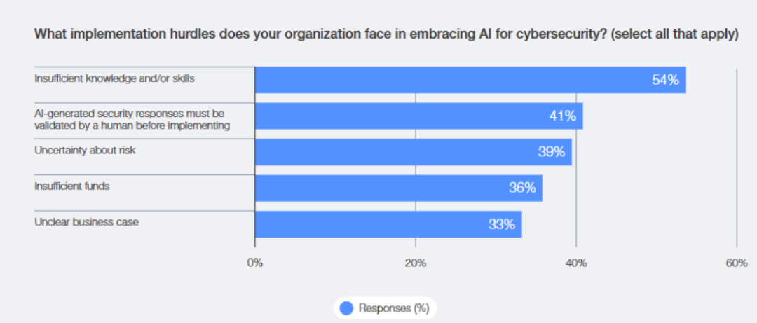 企业在部署AI时也存在障碍,54%的组织受限于相关知识与技能短缺,41%强调AI输出需经过人工验证,39%对潜在风险心存疑虑。