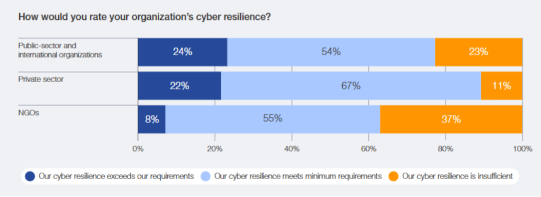 中东与北非地区表现突出,而拉丁美洲、加勒比及撒哈拉以南非洲地区则持续落后。小型组织在资源获取、技能保有方面远逊于大型组织,其韧性不足的可能性是后者的两倍。非政府组织与公共部门的防护能力普遍弱于私营部门。