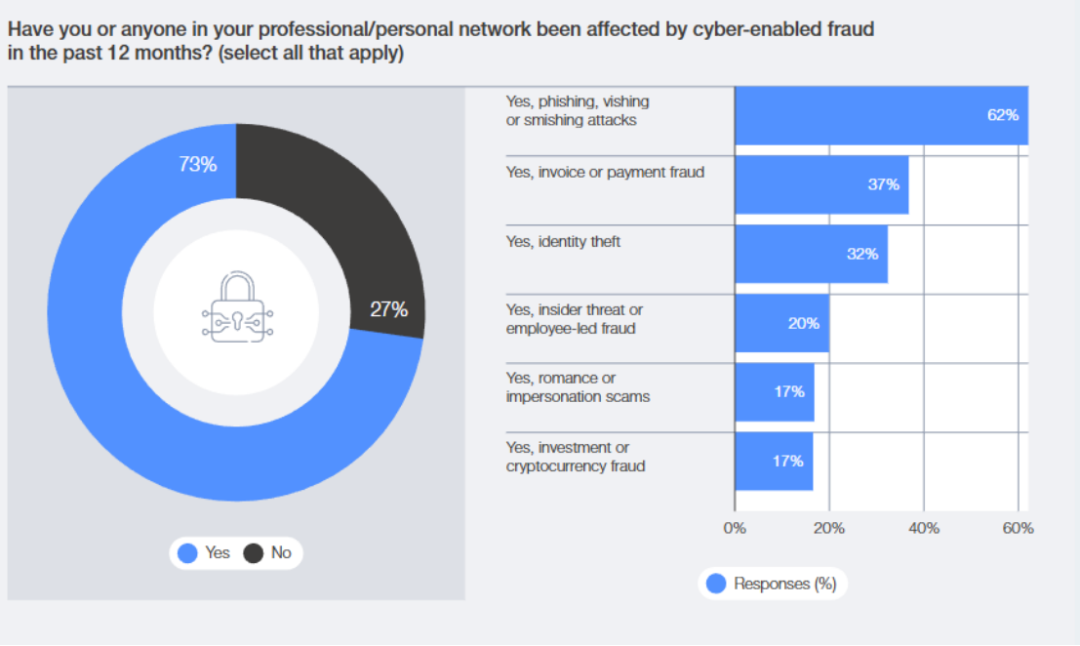 网络犯罪已进入以AI为助推器的新阶段,其规模与社会危害性急剧攀升。73%的受访者个人或者身边人在过去12个月遭受网络欺诈。