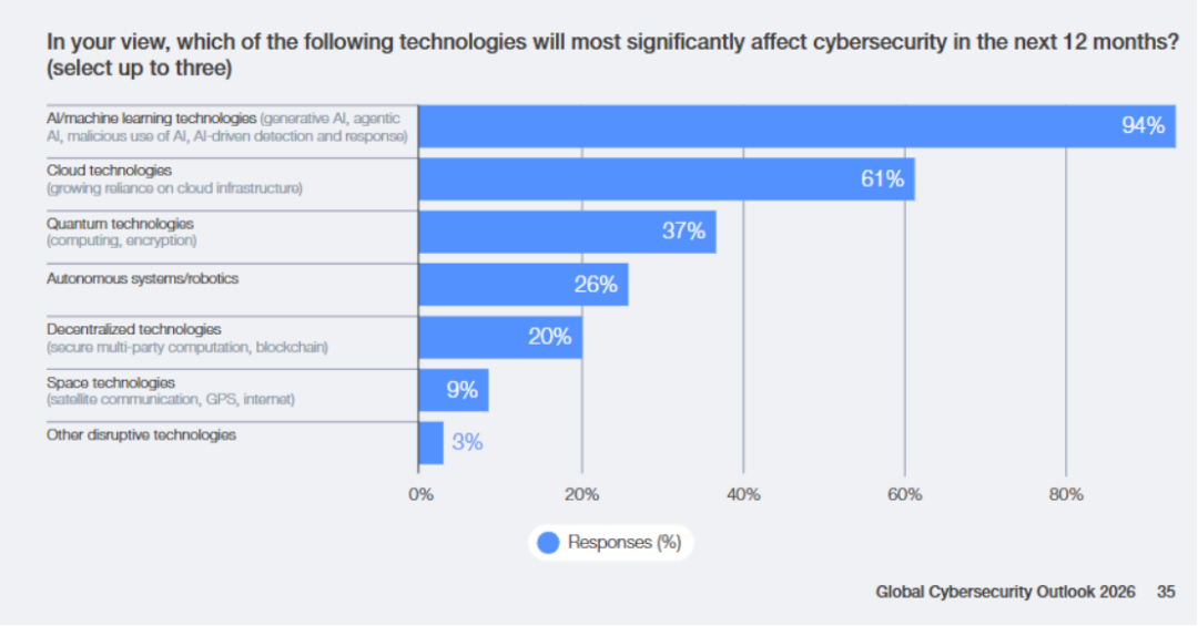 在太空技术方面,2026年,9%的受访者认为太空技术将对网络安全产生最为显著的影响。