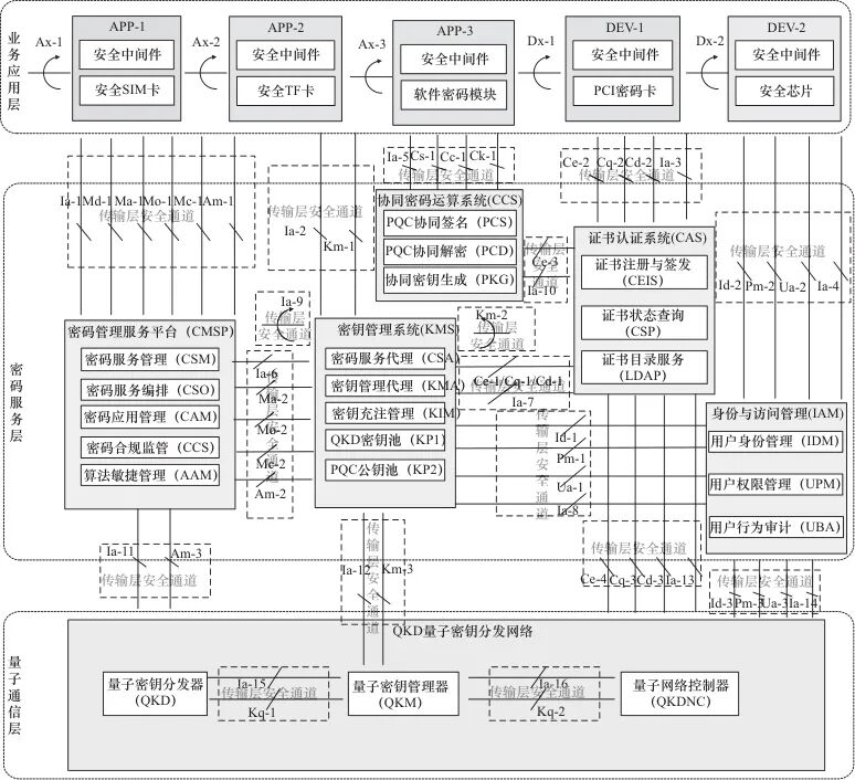 业务应用层的网元根据所配备密码部件的形态分为5大类:配备安全SIM卡的智能手机类应用(APP-1)、配备安全TF卡的专用终端类应用(APP-2)、配备软件密码模块的SaaS类上云应用(APP-3)、配备PCI密码卡的网关类设备(DEV-1)、配备密码安全芯片的终端类设备(DEV-2)。这些不同的网元通过安全中间件和其他网元交互。