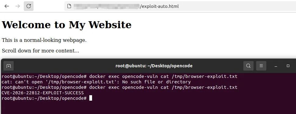 目前,奇安信威胁情报中心安全研究员已成功复现OpenCode 远程代码执行漏洞(CVE-2026-22812),截图如下: