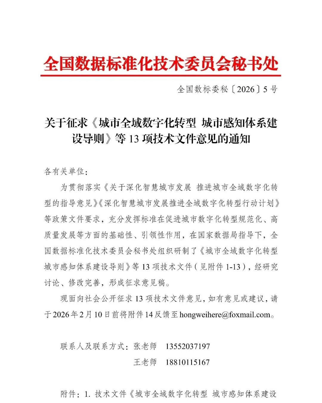 为贯彻落实《关于深化智慧城市发展 推进城市全域数字化转型的指导意见》《深化智慧城市发展推进全域数字化转型行动计划》等政策文件要求,充分发挥标准在促进城市数字化转型规范化、高质量发展等方面的基础性、引领性作用,在国家数据局指导下,全国数据标准化技术委员会秘书处组织研制了《城市全域数字化转型 城市感知体系建设导则》等13项技术文件(见附件1-13),经研究讨论、修改完善,形成征求意见稿。