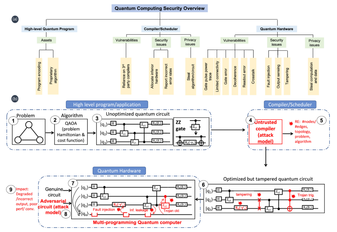 图|(a)量子计算的安全分类法,包括一些示例性资产、漏洞和安全/隐私问题。(b)通过新兴的、寻求信任的编译器进行的攻击(来源:IEEE)
