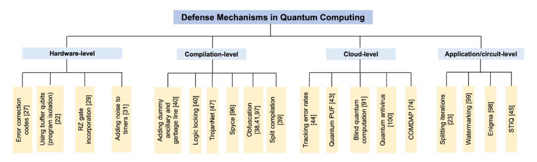 图|量子计算防御模型分类。针对量子系统安全防护的各种防御策略的分类,包括硬件、编译、基于云的访问和应用(来源:IEEE)