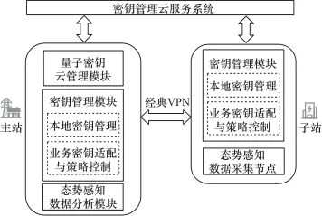 量子密钥调度结构如图3所示,包括3个部分。(1)量子密钥管理云服务系统,是量子密钥调度系统的核心,承担全局密钥调度与跨节点协同管理的职能,为整个体系提供密钥服务支撑,其管理终端位于主站。(2)主站,是量子密钥调度系统的控制中心,兼具量子密钥管理和安全态势感知功能,通过量子密钥云管理模块管理量子密钥的生成与云端分发,通过本地密钥管理模块实现本地业务的密钥供给和管理,通过态势感知数据分析模块分析态势感知数据,评估网络安全态势。(3)子站,是基于主站架构衍生的分布式功能节点,侧重功能执行,通过密钥管理模块保障本地业务系统的密钥供给,依托经典VPN通道构建了分布式的态势感知数据采集节点。