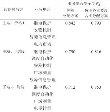 不同通信场景业务集合安全度见表6。主站与子站1之间存在的电力业务在等额分配方案下业务集合安全度为0.842,在按业务重要度占比分配方案下业务集合安全度为0.793,安全度降低约5.82%;主站与子站2之间存在的电力业务在等额分配方案下业务集合安全度为0.790,在按业务重要度占比分配方案下业务集合安全度为0.816,安全度提高约3.29%;子站2与终端之间存在的电力业务在等额分配方案下业务集合安全度为0.712,在按业务重要度占比分配方案下业务集合安全度为0.753,安全度提高约5.76%。整体来看,通信场景中高重要度业务数量越多,重要度占比分配方案对业务整体安全度的提升越大,业务系统的安全度综合提升了3.23%。