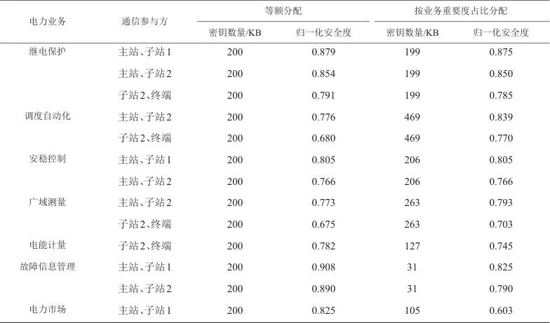 本文实验的数据来源于现场电力业务系统,通过在软件模型中导入实际数据,对比实际系统与模拟系统的输出结果得到结论。本文选取生产控制大区中的部分关键业务进行业务重要度评估,结合实际数据与弹性系数法估算系统业务断面流量。在此基础上限定量子密钥资源总量,通过对比不同分配方案的安全性水平验证评估方法的有效性。