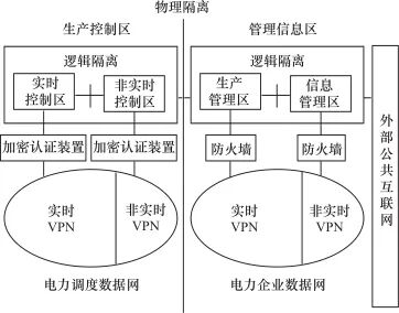 管理业务在与外界通信时需要经过电力数据通信网的实时或非实时VPN,并通过防火墙完成数据过滤,包括生产管理业务和办公管理业务两类。