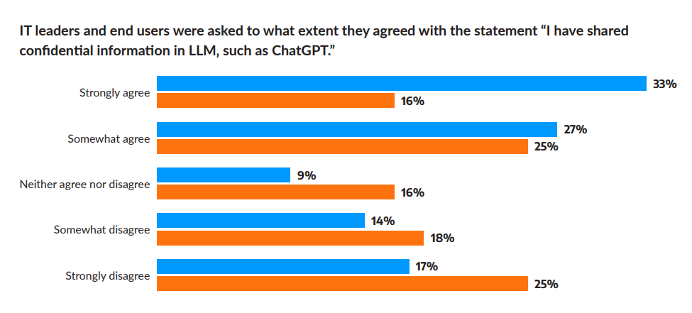 在63%使用ChatGPT等LLM技术或生成式AI工具工作的员工中,41%坦诚曾在这些工具中分享/投喂过机密数据。令人惊讶的是,IT领导者使用这些AI系统的比例更高(80%),且分享机密材料/敏感信息(引发非故意的数据泄露)的比例也更高(60%)。