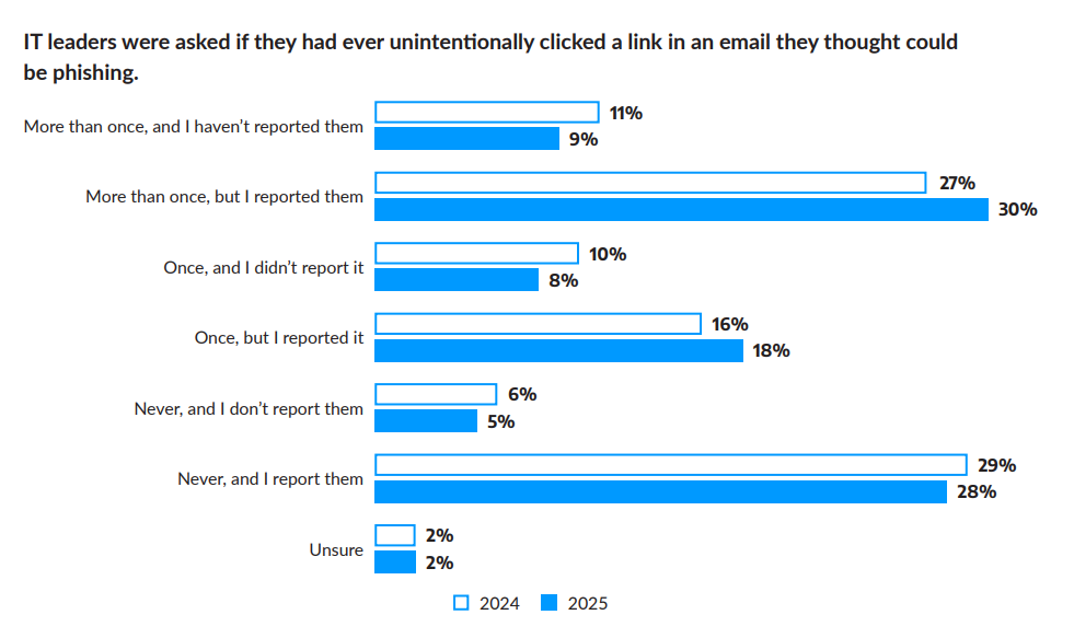 网络钓鱼攻击愈发狡诈: 近2/3的IT领导者和半数员工承认点击过恶意链接。(令人担忧的是,1/5的领导者点击过恶意链接,且未上报事件);