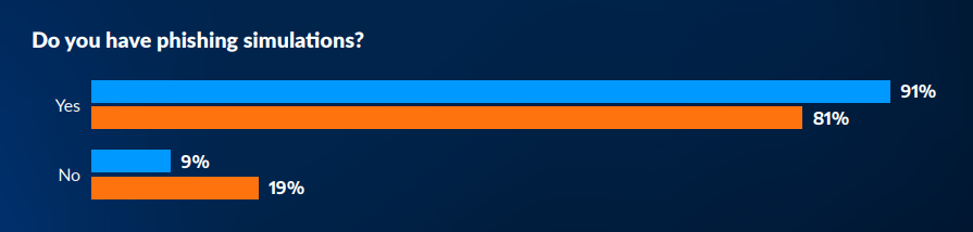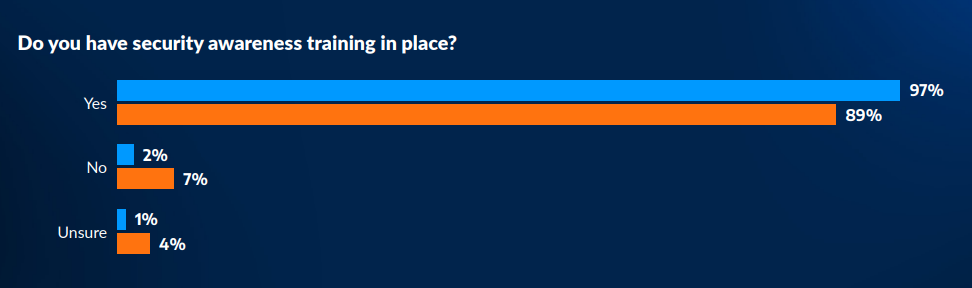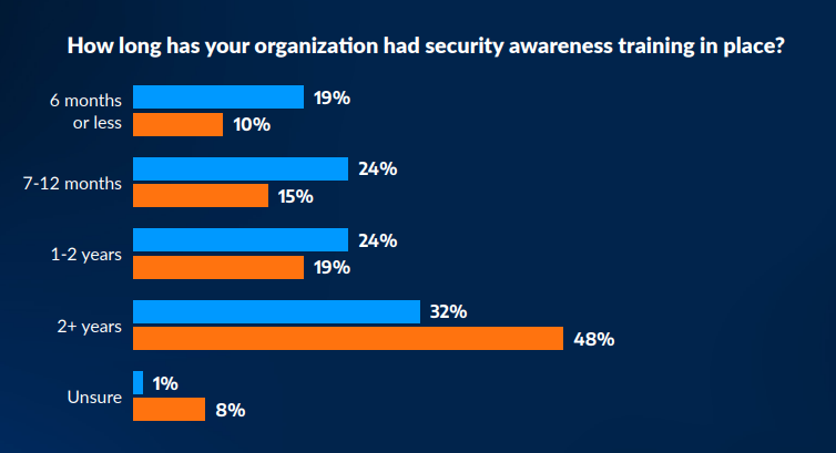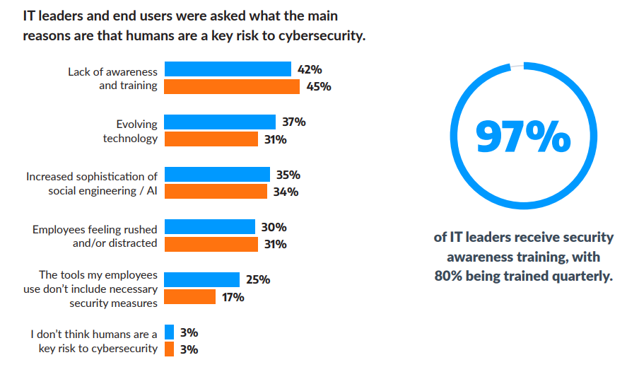 无论是IT与安全领导者还是一般员工都认为,安全意识和培训不足是造成人为因素网络安全风险的首要原因。安全意识培训的频率至关重要!每季度至少接受一次安全意识培训的领导者和员工,更有可能对所在组织抵御网络攻击的能力充满信心,并对保护自身免受网络攻击的能力更有信心。