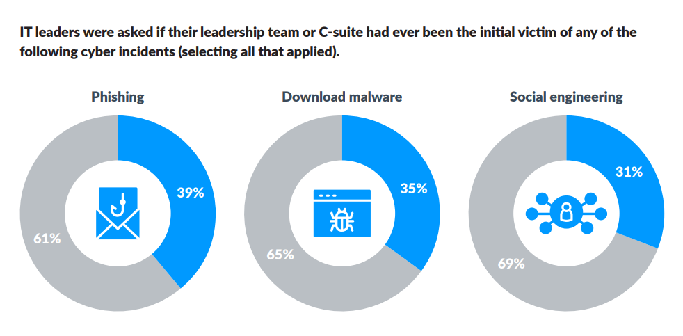 高管成为重点攻击目标: 组织高层管理团队仍是主要攻击目标,有39%的高管遭遇过网络钓鱼攻击,另有35%的高管面临恶意软件感染;