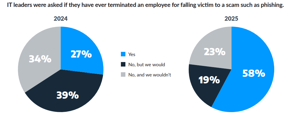 注重培训胜于简单解雇:77%的IT领导者表示会解雇导致安全事件/数据违规的员工,较2024年的66%大幅上升。相比之下,注重预防性与纠正性安全培训的组织风险降低了88%;