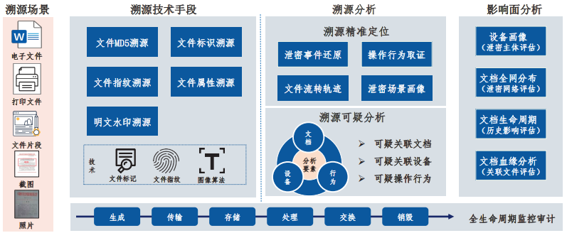 3. 数据溯源技术:全链路追踪+可视化归因。实时监控终端用户对商密文档的操作行为,以及使用打印、刻录、移动存储、邮件等通道的外发行为,通过大模型关联终端用户文档操作审计、终端用户通道外发审计等多维度的数据,支持通过文件MD5、文件标记、文件指纹、文件片段、文件属性、文件图片、文件水印信息等技术实现文件溯源(见图),通过溯源精准定位和可疑分析进行影响面分析,最终溯源效果如下。