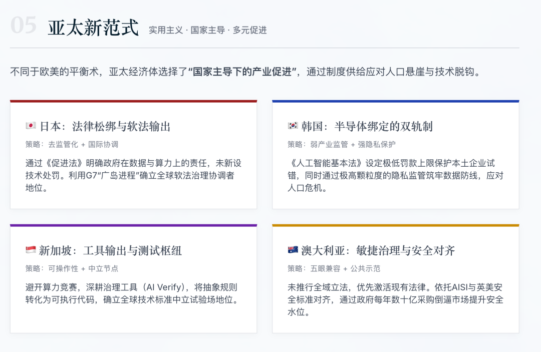 整体而言,亚太地区的治理逻辑在于:在法律框架内确立发展的优先权,将政策重心聚焦于解决数据流通、隐私合规及技术测试等制约产业落地的具体问题,以应对人口结构变化与全球技术脱钩的双重挑战,通过制度供给保障技术发展的红利。