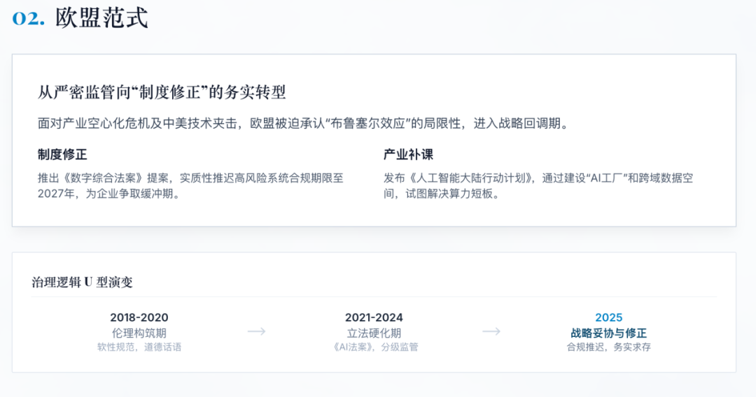 进入2025年,欧盟的治理逻辑经历了一次痛苦的现实检验。面对几乎没有国家真正效仿欧盟模式的尴尬局面,以及“布鲁塞尔效应”可能成为阻碍创新的“布鲁塞尔幻象”的风险,欧盟被迫承认单方面定义市场规则的局限性。《数字综合法案》提案的发布,推迟《人工智能法案》关键条款生效实质上是监管层向产业界的务实妥协,试图用监管的时间差,换取欧洲产业追赶中美技术代差的微薄空间。