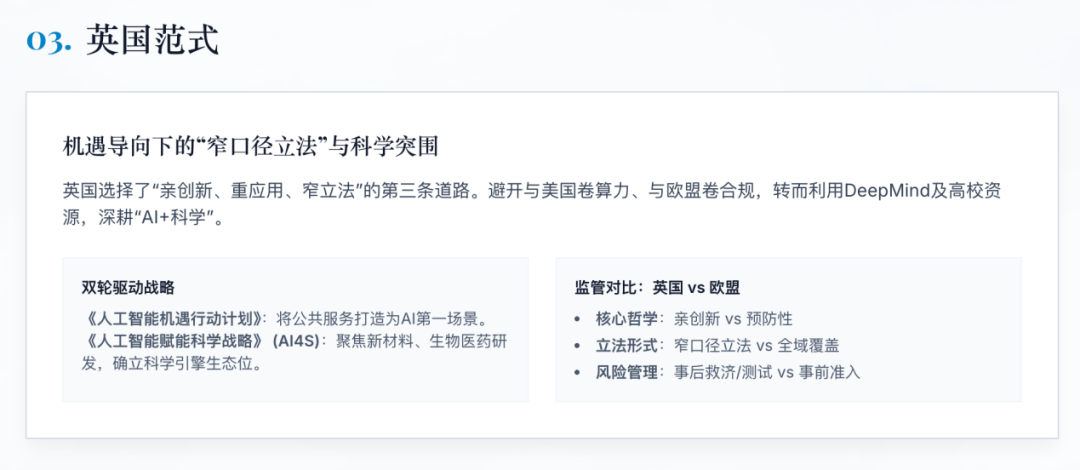 2025年,英国在人工智能治理领域确立了“亲创新、重应用、窄立法”的第三条道路。与欧盟构建全域法律堡垒的路径不同,英国新政府通过《人工智能机遇行动计划》与《人工智能赋能科学战略》(AI4S)双轮驱动,将政策重心从单纯的“防范生存风险”回调至“利用AI驱动经济增长”与“科学发现”。英国采取了极具辨识度的“混合治理”策略:在底座层面,保留《人工智能监管白皮书》确立的分行业灵活监管框架;在顶层设计上,推进针对“前沿模型”的窄口径立法。旨在利用脱欧后的制度敏捷性,在中美竞争的夹缝中,将英国打造为全球AI公共服务落地的最佳测试场与科学发现引擎。